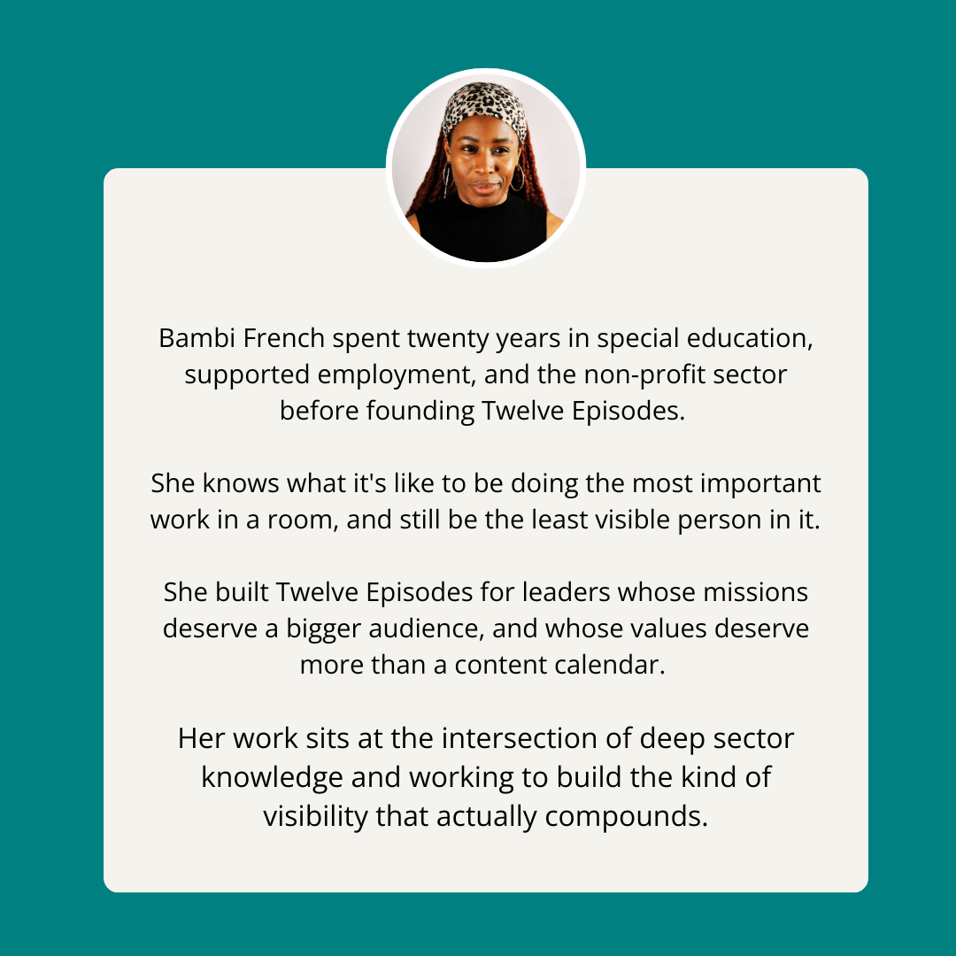 Bambi French, founder of Twelve Episodes, has spent years watching brilliant, mission-driven leaders stall: not because their work wasn't worthy of attention, but because they were buried under marketing overwhelm.